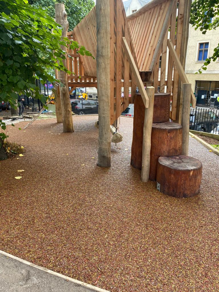 In 2002, Star Rubber Environmental Ltd developed a solid bound rubber playground mulch system called TigerMulch, which is durable and aesthetically pleasing. This free draining, sustainable and bound synthetic surface is developed from 100% recycled truck tyres combined with a high performance resin. This synthetic surface resembles loose woodchip and stays where it is put as the particles are bound together in the installation process. The surface is easy to clean and will accommodate a mechanical sweeper. It is available in a wide range of colours and a sub-base is not required on most soils. We are the UK's only manufacturer and licensor of the TigerMulch product, so we always make sure that our team of fully trained specialists install this unique system, which is ready for the next day in most cases.