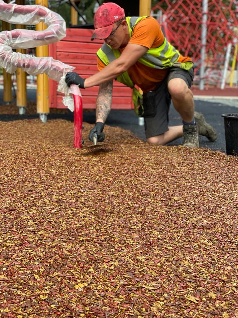 Star Rubber Manufactured a bespoke blend of TigerMulch, using a Light and Dark Green blend to fit in well with the surrounding parkland yet contrast against the Blue EPDM wet pour.